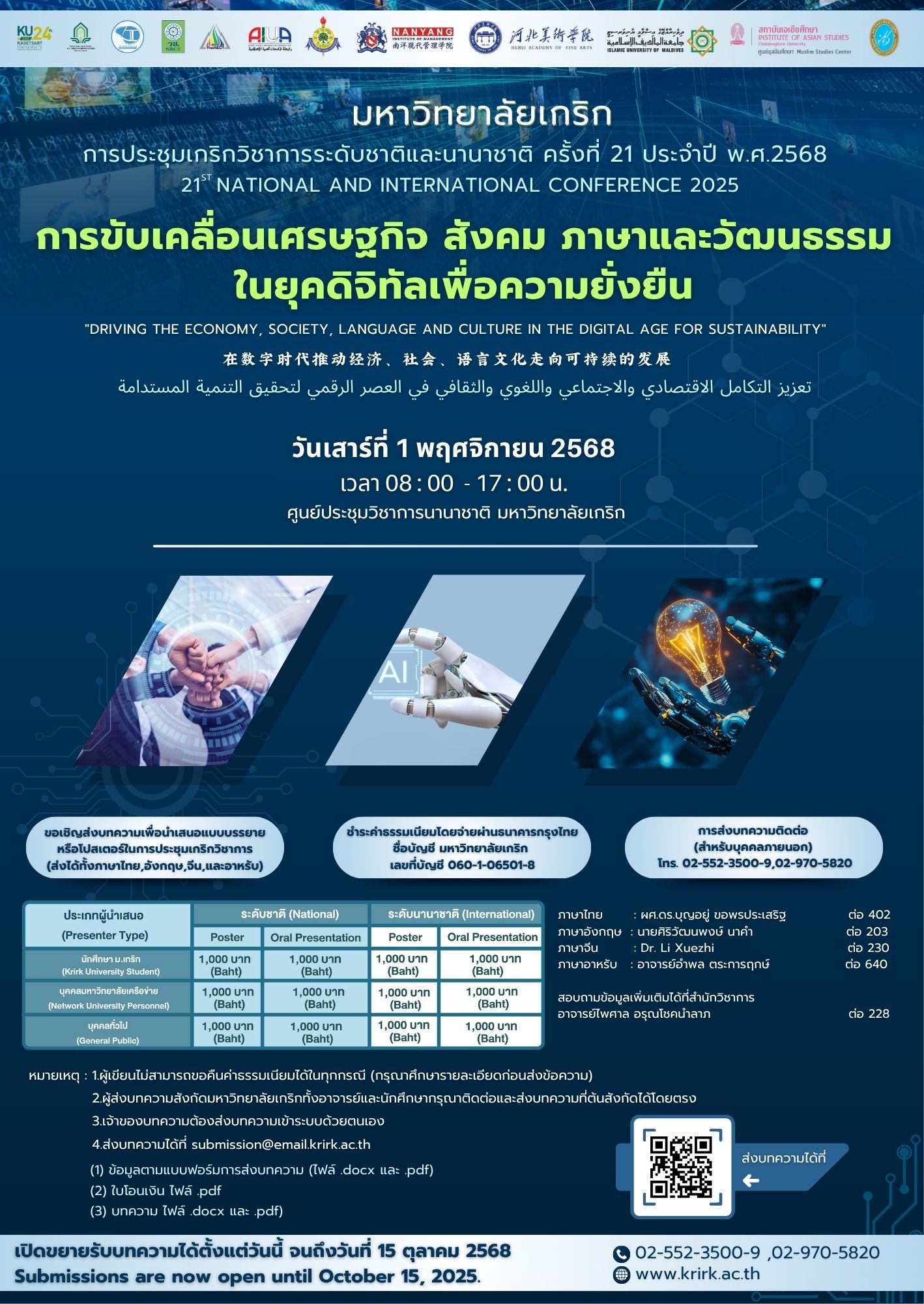 1 พฤศจิกายน 2568 | นำเสนอผลงาน ในการประชุมเกริกวิชาการระดับชาติ |